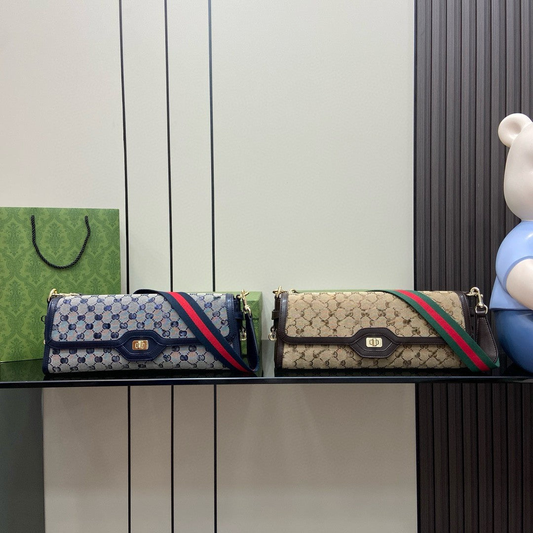 A detachable and adjustable red-and-green webbed strap threads through side leather loops, adding both functionality and structure to the design. The interior is lined with a cotton-linen blend and includes a secure zip pocket for essentials.